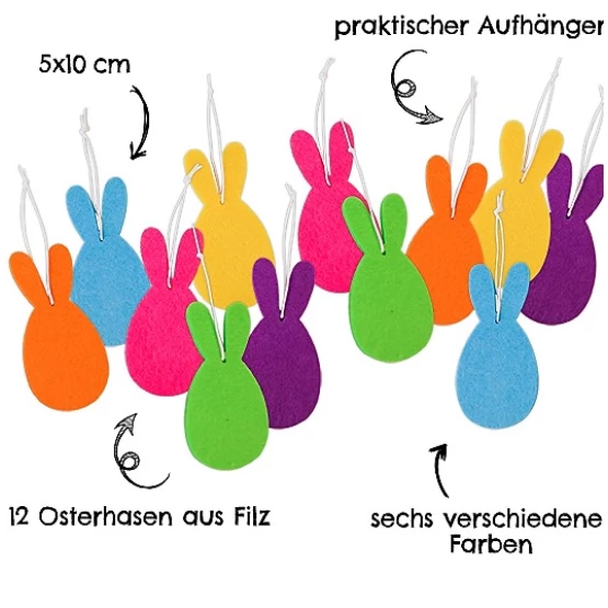 12 dekorative bunte Filzhasen zum Aufhängen und Dekorieren.Im Handumdrehen erschaffst du eine tolle Osterdekoration, die du an Zweigen aufhängen kannst. Durch die leuchtenden Farben eigenen sie sich auch sehr gut zur Gestaltung von Geschenken für Kinder.