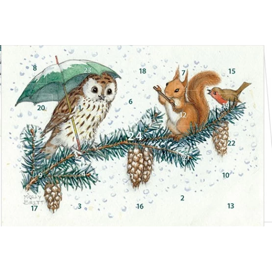 Adventskalender. Musizierende Eule, Eichhörchen und Rotkehlchen und weitere Tiere hinter den 24 Türchen.