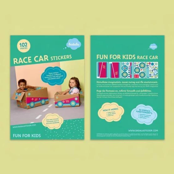 Με τα αυτοκόλλητα BADALA, κάθε κουτί μπορεί να μετατραπεί σε ένα μοναδικό παιχνίδι. Το σετ RACE CAR σας επιτρέπει να κατασκευάσετε ένα σούπερ γρήγορο αγωνιστικό αυτοκίνητο