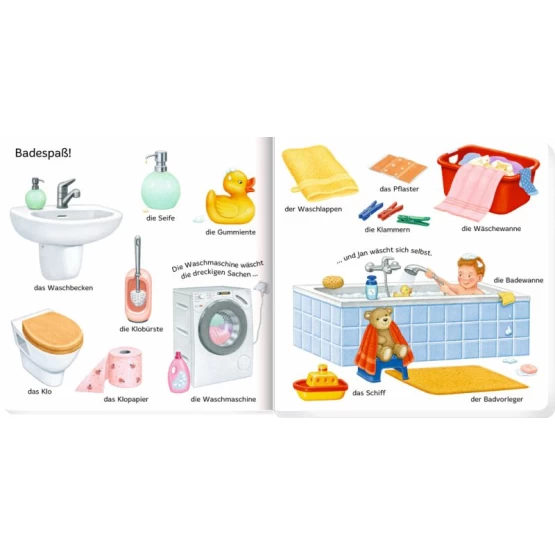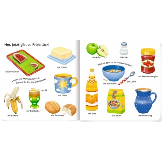 100 realistisch illustrierte Gegenstände aus dem Alltag laden mit kurzen Fragen zum Sprechen und Immer-wieder-Anschauen ein. Dieses Pappbilder-Wörterbuch bietet die ideale Sprachförderung für jedes Kind!