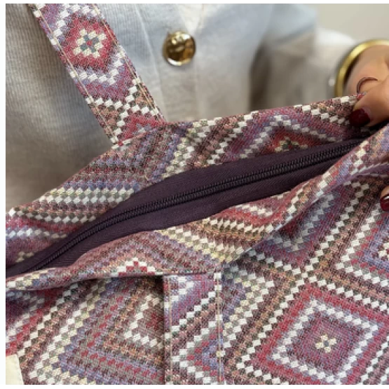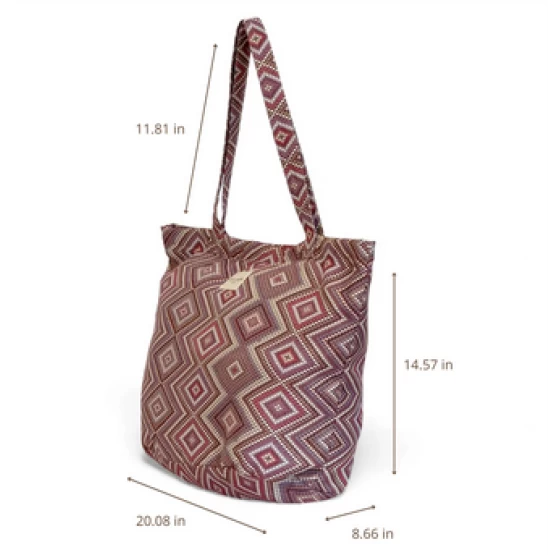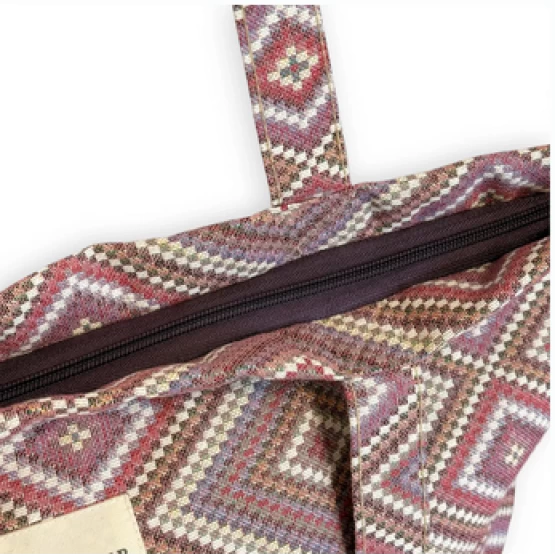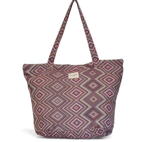 Large zippered tote bag with shoulder straps. Made from jacquard fabric (80% cotton, 20% polyester) featuring a geometric pattern in pink and lilac tones. Includes a top zipper closure. For proper care, we recommend hand washing in cold water and not tumble drying.