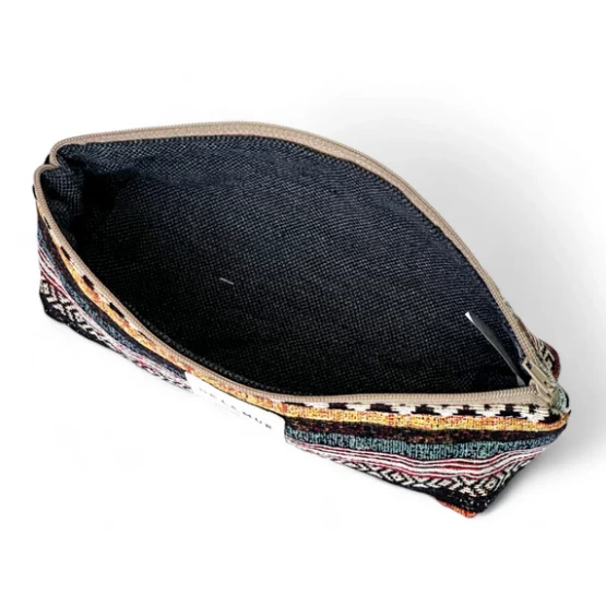 Zippered pouch with a top zip. Made with fine fabric with a floral print in black and beige tones. Each item may vary in the print, depending on where the piece was cut. Lined with thick gray fabric on the inside. For proper care, we recommend hand washing in cold water and not using a dryer.