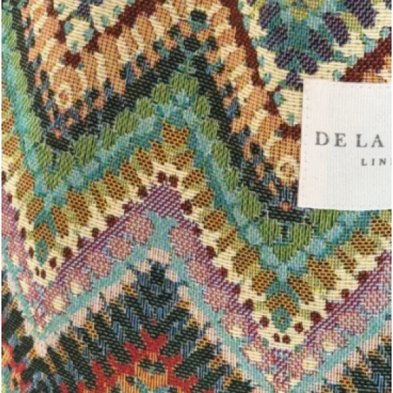 Small bag with handles for carrying over the shoulder. Made with a thick jacquard fabric featuring a multicolored geometric zigzag print. For proper care, hand wash in cold water and do not tumble dry.