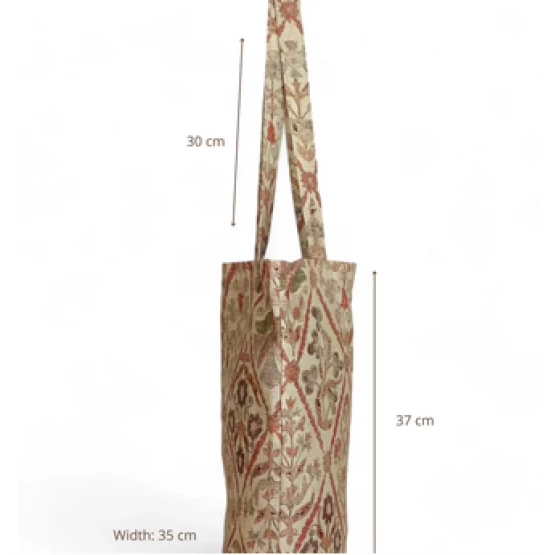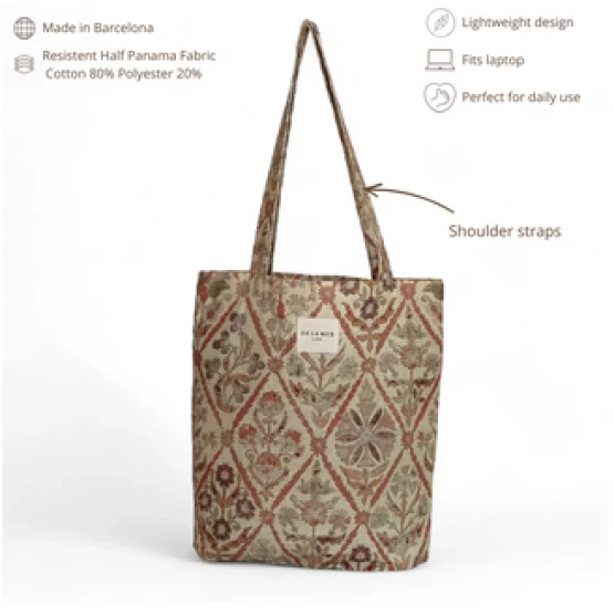 A compact and durable half-panama tote bag with a geometric print in terracotta tones, perfect for everyday use. It features comfortable handles and a top opening for easy access to your belongings. Ideal for carrying your essentials in style. Made in Spain.