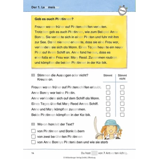 Lesekompetenz ist eine der wichtigsten Schlüsselqualifikationen: Das Übungsheft Lesen für Klasse 2 in Deutsch führt die Kinder behutsam und spielerisch mit kurzen, spannenden Texten an das genaue Lesen, das Erfassen von Inhalten und die gezielte Entnahme von Information heran. Auf je einer Doppelseite wird eine übersichtliche, in sich geschlossene Lerneinheit aus einem Text und dazu passenden Aufgaben trainiert. Das bewährte Sticker-Belohnungssystem stellt für die Kinder einen zusätzlichen Anreiz dar: Für jede bearbeitete Seite darf das Kind einen Sticker in ein Wimmelbild kleben. Das Lösungsheft für die schnelle Selbstkontrolle kann mit einem Handgriff herausgetrennt werden.