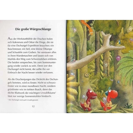 Der kleine Drache Kokosnuss und seine Freunde Matilda und Oskar finden beim Spielen ein kleines Stück Leder, auf dem ein seltsames Bild eingezeichnet ist. Die kluge Matilda erkennt sofort, dass das der Felsen unweit der Stachelschwein-Höhle sein muss. Hier ist sicher ein Schatz versteckt!, vermuten Kokosnuss und Oskar und rüsten sich sogleich für eine große Schatzsucher-Expedition. Doch anstelle von Gold und Diamanten finden die drei Freunde unter dem Felsen einen weiteren Teil der Schatzkarte. Die Karte führt sie mitten in einen gefährlichen Dschungel. Kokosnuss, Matilda und Oskar müssen all ihren Mut zusammen nehmen, als sie Würgeschlangen, Tigern und Krokodilen begegnen. Doch am Ende ihrer abenteuerlichen Reise wartet eine große Überraschung ...