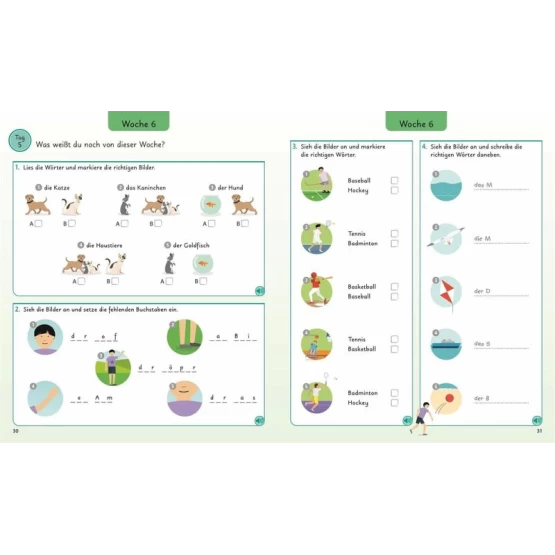 Dank der speziellen Methode erinnert man sich ganz einfach an 5 Wörter jeden Tag: Vokabeln aus dem Kinderalltag, veranschaulichende, schöne Illustrationen und eingesprochene Hörbeispiele sowie Klappen zum Verdecken der Wörter beim Üben helfen und machen Spaß! Am Ende jeder Woche gibt es Wiederholungsübungen zum Vertiefen. So leicht war Deutsch lernen noch nie!