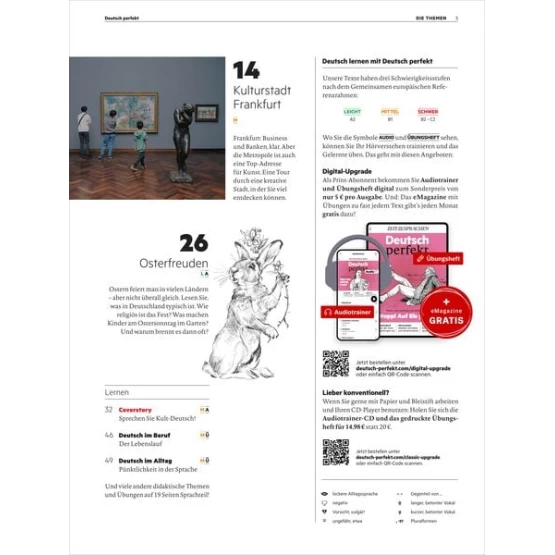 Mit Deutsch perfekt trainieren Sie Ihre Sprachkenntnisse umfassend und erfahren gleichzeitig spannende Details über das Leben in den deutschsprachigen Ländern. Aktuelle Themen, wie Kultur, Gesellschaft oder der Alltag in Deutschland, Österreich und der Schweiz werden mit unterschiedlichen Übungen zu Grammatik, Wortschatz und Vokabeln kombiniert.