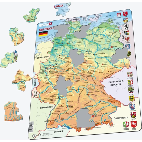 "Puzzle mit einer physischen Deutschlandkarte mit den Namen der Städte, Flüsse, Seen, Berge, Gebiete und des Meeres. Um die Karte herum finden Sie das Wappen der Staaten mit Namen."