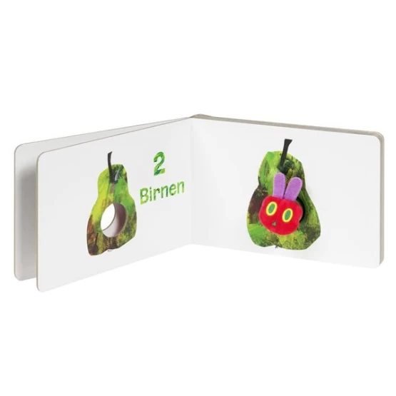 Wer guckt denn da aus dem Buch heraus? Das ist doch die kleine Raupe Nimmersatt! Seite für Seite kann man die lustige Stofffingerpuppe durch die Löcher in den Seiten krabbeln lassen.