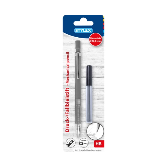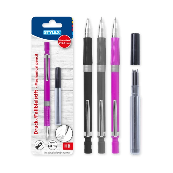 Druck-/Fallbleistift, mit Anspitzer im Druckknopf, Härtegrad: HB, Strichstärke: 2 mm, inkl. 6 Ersatzminen, farbig sortiert, auf Blisterkarte