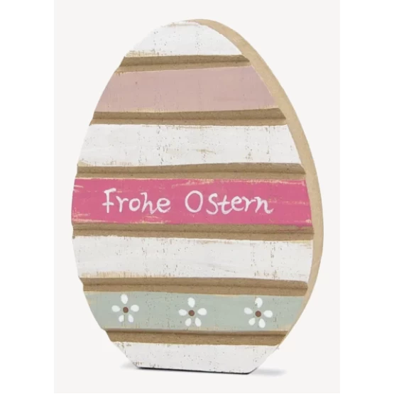 Oster-Dekoration in Form eines Eies, das "Frohe Ostern" wünscht . Es ist aus Holz gefertigt und kann jeden Raum schön dekorieren