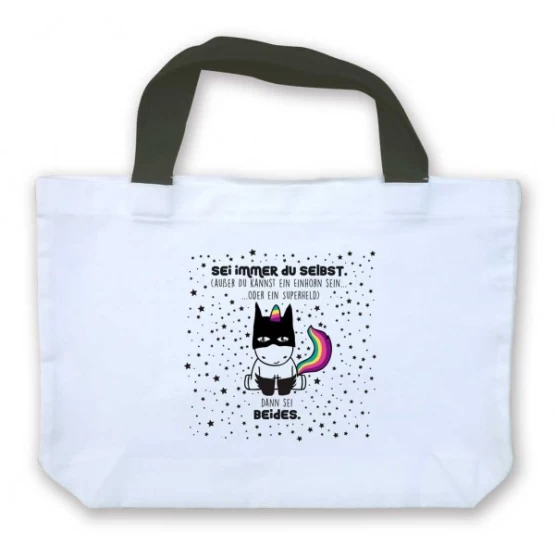 Die praktische Einkaufstasche mit Motiv "Sei immer Du selbst. Außer Du kannst ein Einhorn sein. Oder ein Superheld. Dann sei beides."