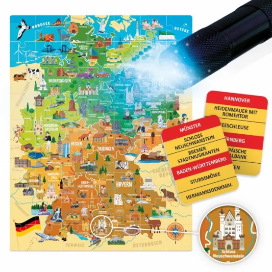 Entdecke mit diesem spannenden Spiel die Geografie der Bundesrepublik Deutschland! Suche auf der Karte nach Städten und finde mit der magischen Taschenlampe berühmte Orte, Wahrzeichen, Elemente der Flora und Fauna und viele andere typische Aspekte der Kultur Deutschlands!