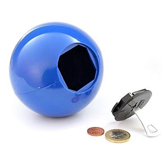 Hier kommt die Spardose "Kugel mit Augen". Wie eine kleine Eule hockt Sie im Regal und bewacht Euer Erspartes.