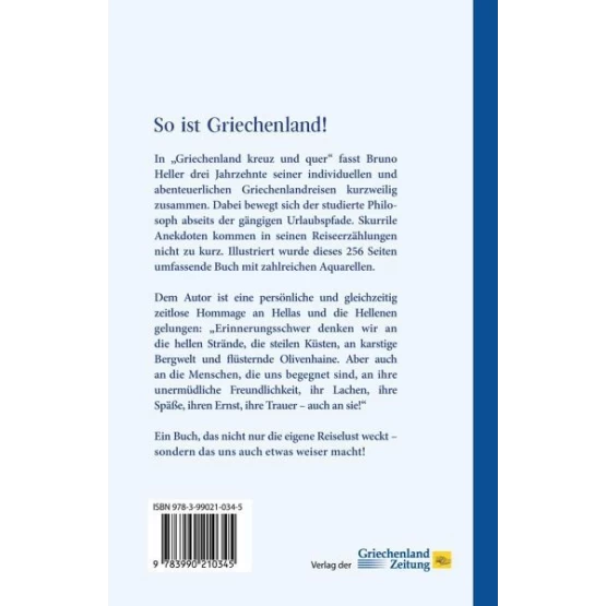 Ihren Anfang nimmt sie 1981 in Tolon, einem Fischer- und Badeort auf der südlichen Peleponnes. Seit jenem denkwürdigen Jahr war der Autor von Griechenland nicht mehr losgekommen. Für ihn gibt es tausend und ein Gründe, immer und immer wieder dorthin zu fahren. Wann immer sich die Gelegenheit bot, hat es ihn an die "Küsten des Lichtes" gezogen. Und so lernt man beim Lesen Land und Leute im nordgriechischen Ioannina kennen, erfährt Erstaunenswertes über die griechischen Götter, genießt die Schönheit der Kykladen und kämpft sich durch das wuselige Großstadtleben Athens. Hellers Biographie - er ist studierter Philosoph - zeigt sich in diesem persönlichen Werk. In dem 256 Seiten umfassenden Buch finden berühmte Denker und Poeten der griechischen Antike ihren Platz. Zahlreiche Aquarelle aus der Hand des Autors geben "Griechenland kreuz und quer" noch mehr Farbe. Sie zeigen den Augen des Betrachters das, was in Worten kaum zu sagen ist. Dem Autor ist eine persönliche und gleichzeitig zeitlose Hommage an Hellas und die Hellenen gelungen: "Erinnerungsschwer denken wir an die hellen Strände, die steilen Küsten, an karstige Bergwelt und flüsternde Olivenhaine. Aber auch an die Menschen, die uns begegnet sind, an ihre unermüdliche Freundlichkeit, ihr Lachen, ihre Späße, ihren Ernst, ihre Trauer - auch an sie!" Ein Buch, das nicht nur die eigene Reiselust weckt - sondern auch ein Stück schlauer macht!
