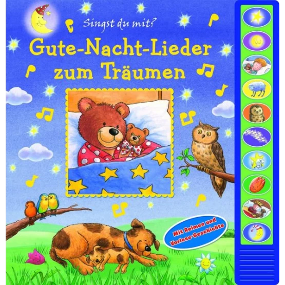 Mit liebevoll illustrierten Geschichten, Liedtexten, Noten und Melodien entdecken Kinder gemeinsam mit ihren Eltern die Freude am Singen und Lesen und erweitern ihren Wortschatz. Das farbig illustrierte, gebundene Pappbilderbuch von pikids sammelt auf40 detailreichen Seiten bekannte und beliebte Kinderlieder mit Notensatz und lädt zum Mitsingen ein. Eine kurze Gute-Nacht-Geschichten zum Vorlesen, Reime und stimmungsvolle Lieder sind ideal für das tägliche Einschlafritual und bereiten Kleinkinder optimal auf das Zubettgehen vor. Die Kinder können dieses strapazierfähige und stabile Kinderbuch auch selbstständig entdecken. Dieses kleinkindgerechte Bilderbuch mit wattiertem Umschlag und Fenster ist ein tolles Geschenk für Jungen und Mädchen ab 18 Monaten und gut geeignet für unterwegs