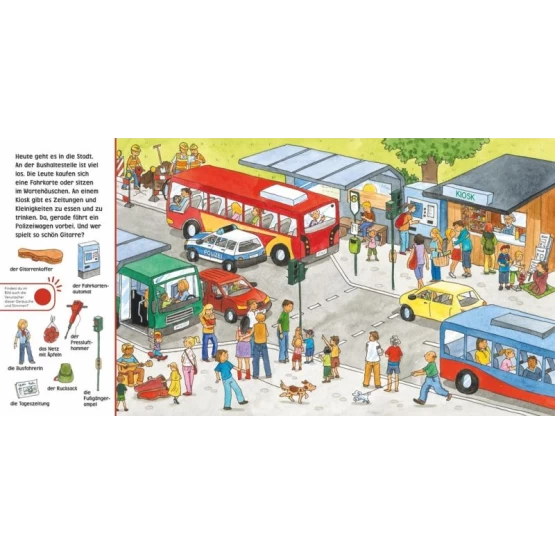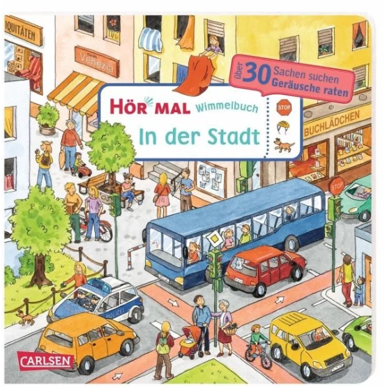 Mehr als 30 Sounds laden dazu ein, die Stadt zu erkunden. 6 Wimmelbilder rund um Straßenverkehr, Einkaufspassagen, Wochenmarkt, Stadtpark mit Spielplatz und vielem mehr werden mit Bildchen am Rand ergänzt, die zum gezielten Suchen und Finden einladen. Ein Druckknopf auf jeder Seite löst zudem eine Reihe von aufeinanderfolgenden verschiedenen Geräuschen und kurzen Redesequenzen aus, deren Verursacher ebenfalls in den großen Wimmelbildern gesucht werden können.