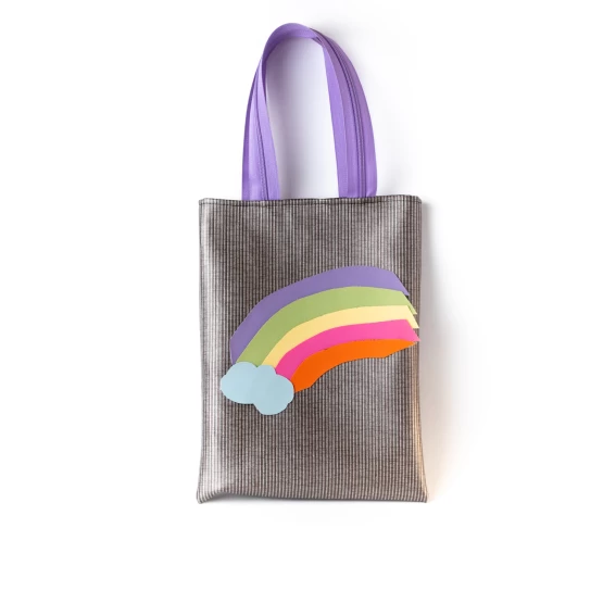 Handgemachte Stofftasche mit Regenbogen 21x29 cm (lila Band)