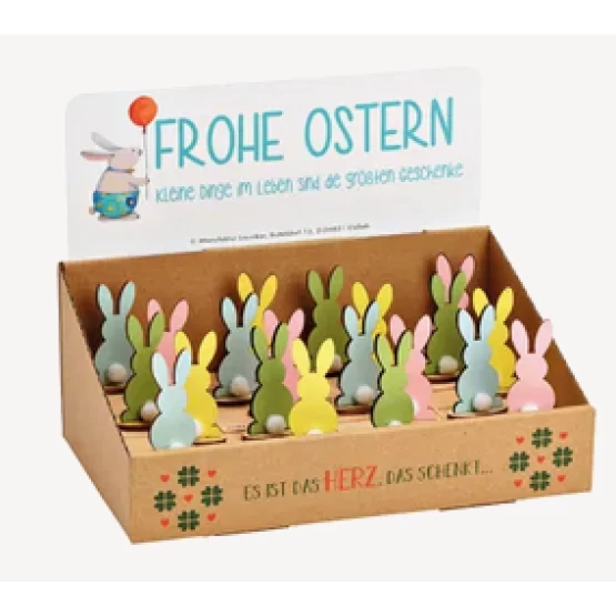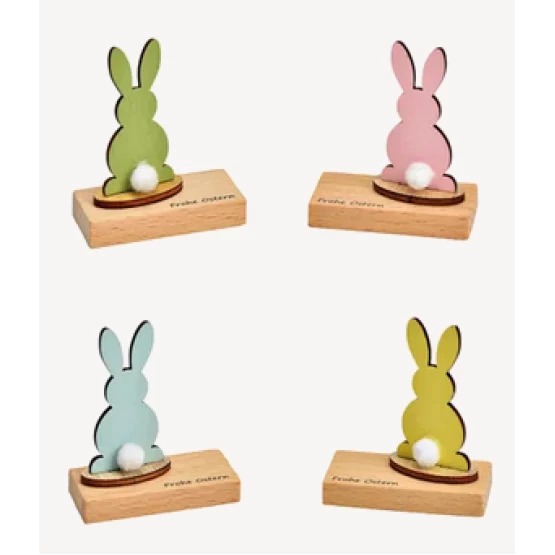 Oster-Dekoration in Form eines kleinen Hasen in 4 Farben, gelb, hellblau, rosa, grün. Der Hase ist aus Holz gefertigt und kann jeden Raum schön dekorieren.