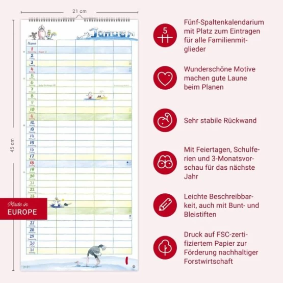 - Gut geplant durchs Abenteuer Alltag, mit unserem meistverkauften Familienkalender: 5 Spalten Platz für alle wichtigen Termine von Groß und Klein