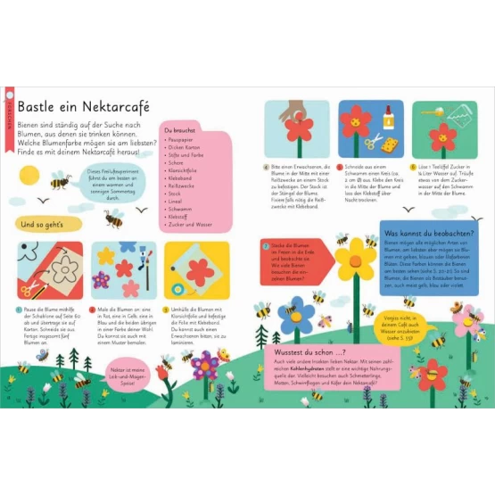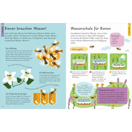 In diesem reich illustrierten Bienenbuch lernen Kinder ab 7 Jahren alles Wissenswerte über eines der wichtigsten Insekten der Erde. Sie erfahren dank kurzer informativer Texte, welche Bienenarten es gibt, wie ein Bienenstaat aufgebaut ist, wie Bestäubung funktioniert oder was ein Imker tut. Und die Nachwuchsbienenforscher dürfen auch selbst tätig werden: Sie können ein Nektarcafé basteln, einen Honiggeschmackstest machen oder Hummeln und Bienen ein Heim bieten. Am Ende des Buches ist klar: Es ist für Mensch und Natur gleichermaßen wichtig, die Bienen und ihre Verwandten zu schützen.