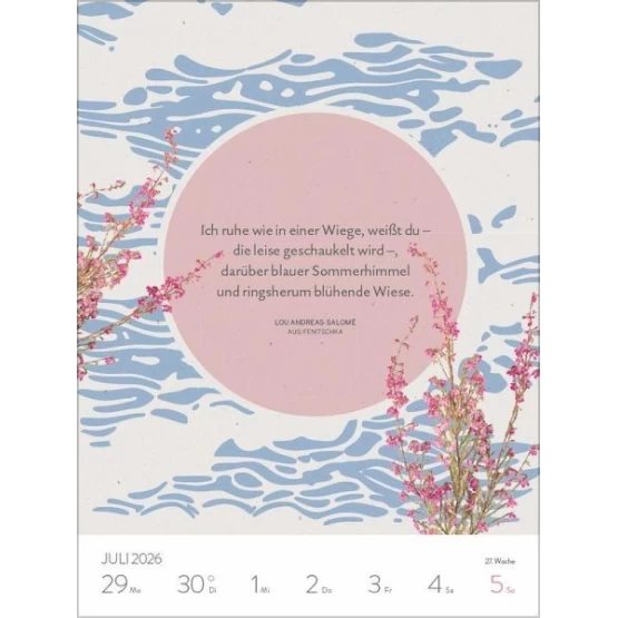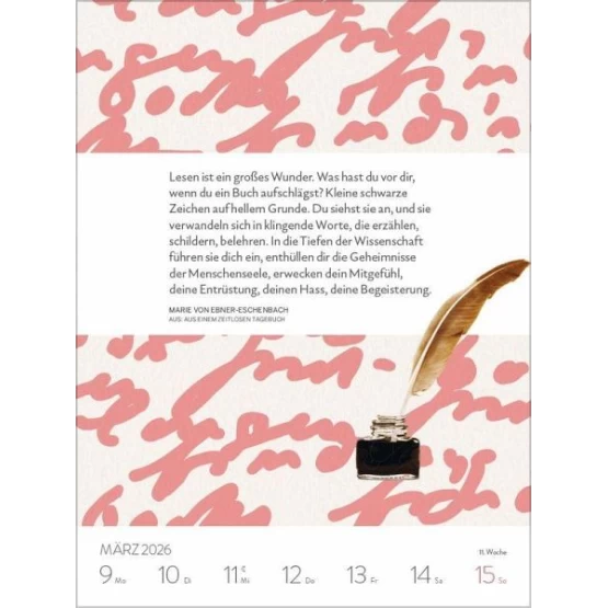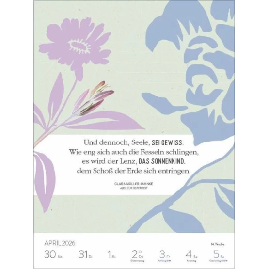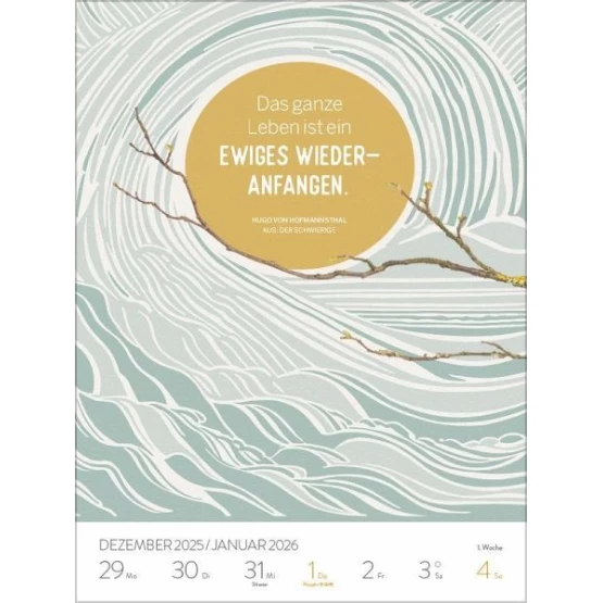 In diesem Wochenkalender sind 53 Gedanken, Zitate und Gedichte bekannter Autorinnen und Autoren in einem modernen Look in Szene gesetzt und werden so direkt in die Gegenwart katapultiert. Wundersch ön gestaltet und ein Must-have für alle Literatur-Fans. Mit Klimabeitrag hergestellt auf nachhaltig produziertem Papier.