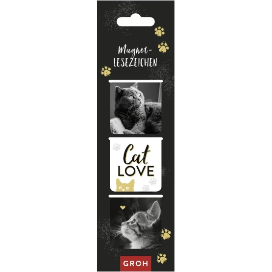 Auf dem Sofa sitzen mit einem Buch in der Hand und einer schnurrenden Samtpfote auf dem Schoß – für Katzen-Fans ist das Quality Time vom Feinsten, denn Katzen und Bücher, das passt einfach perfekt zusammen. Deshalb zieren Katzen jetzt auch diese praktischen Magnetlesezeichen mit Goldveredelung. Anders als andere Merkhilfen im Buch halten die magnetischen Lesezeichen zuverlässig an der eingemerkten Stelle, ohne die Seite zu beschädigen – auch im Notizbuch in der Handtasche oder im Schulbuch im Ranzen.