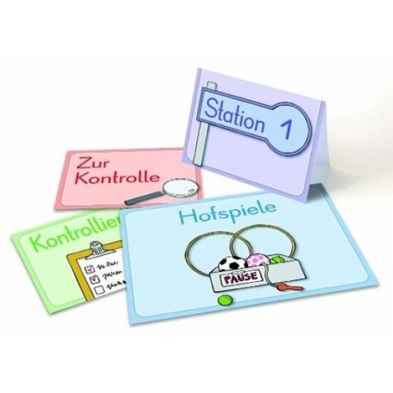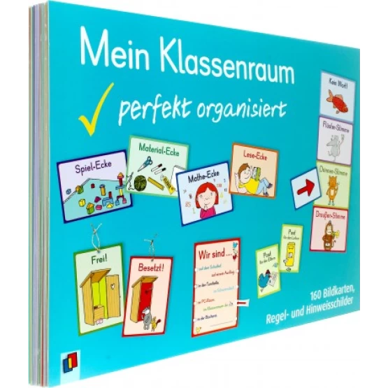 "Wo sind denn schon wieder?" ? Eine Frage, die einem den netzen Nerv kosten kann. Denn auch das beste Ordnungssystem muss kapitulieren, wenn 25 kleine Chaos-Könige in einem Klassenraum lernen und arbeiten. Dank dieser farbenfrohen Bildkarten, Regel- und Hinweisschilder finden aber selbst nach der intensivsten Materialschlacht alle Dinge zurück zu ihrem Platz: Die Karten teilen den Klassenraum in Bereiche und geben ihm eine klare Struktur, die für jedes Kind verständlich ist. So landet der Kleber wieder im Materialschrank, das Tierbuch im Fach in der Klassenbücherei und das Hofspielzeug in seiner Kiste. Falls doch einmal etwas partout keinen Platz oder Besitzer hat, gibt es zudem eine Fundgrube. Weitere kleine Helfer, wie Stationen- und Tischkarten, Lernometer, Lautstärkebarometer oder eine Kloampel, erleichtern und verschönern Ihnen den Schulalltag zusätzlich ? und bringen im Handumdrehen Ordnung in jedes Chaos.