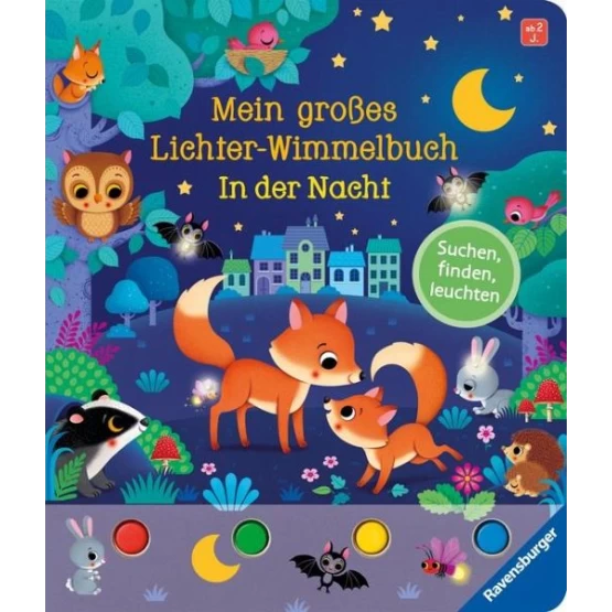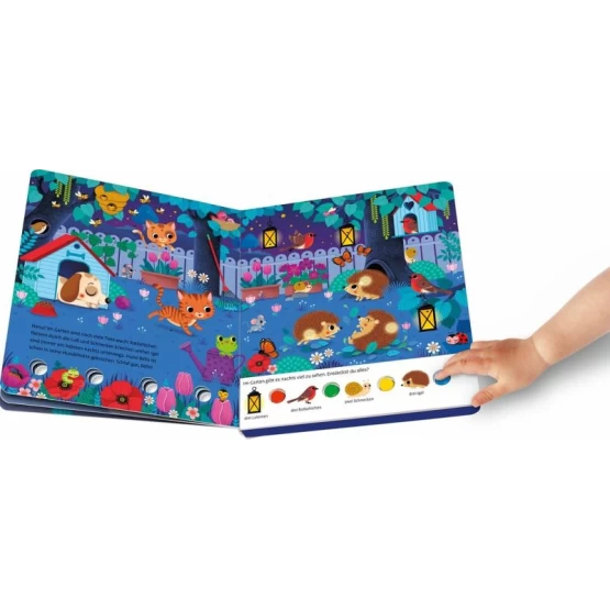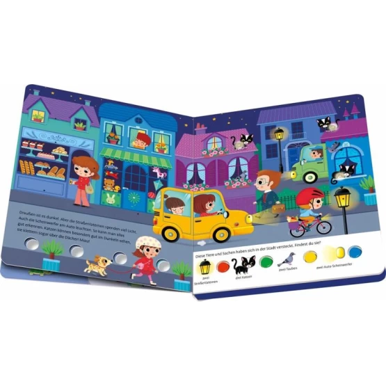 Kannst du alle Katzen, Igel und Eulen finden? Die Lichter helfen dir dabei! Einfach auf den Knopf drücken und die Lichter verraten dir, wo sich die Tiere und Dinge verstecken.
