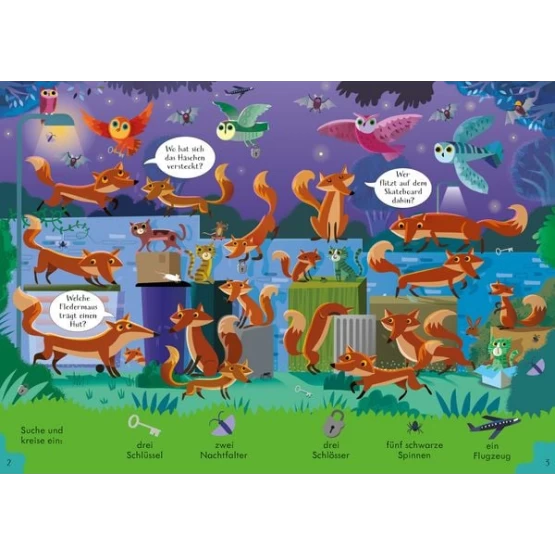 Nach Einbruch der Dunkelheit gibt es viel zu sehen! Entdeckst du das blauäugige Buschbaby, den Gecko mit Kopfhörern und einen Ameisenbär mit Pulli? Und findest du auf jeder Wimmelseite die kleine weiße Maus, die sich versteckt? Vielfältige Such- und Zählaufgaben laden zum genauen Hinschauen ein!