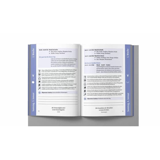 Dieser Mond-Taschenkalender besitzt das gewisse Etwas: Wer mehr über das faszinierende Thema der Mondeinflüsse auf unser Leben erfahren möchte, als die meisten Kalender zu bieten vermögen, ist hiermit bestens bedient. Die Autorin bewertet den Einfluss des Planetenherrschers auf das Gesamtjahr. Sie gibt einen kulturhistorischen Abriss bezüglich der Bedeutung des Mondes für die Menschen von der Antike bis heute. Und sie erklärt präzise die Wirkungen des Mondes aufgrund seiner Phasen, seines Stands im Tierkreis und seines Verhältnisses zu den Planeten.