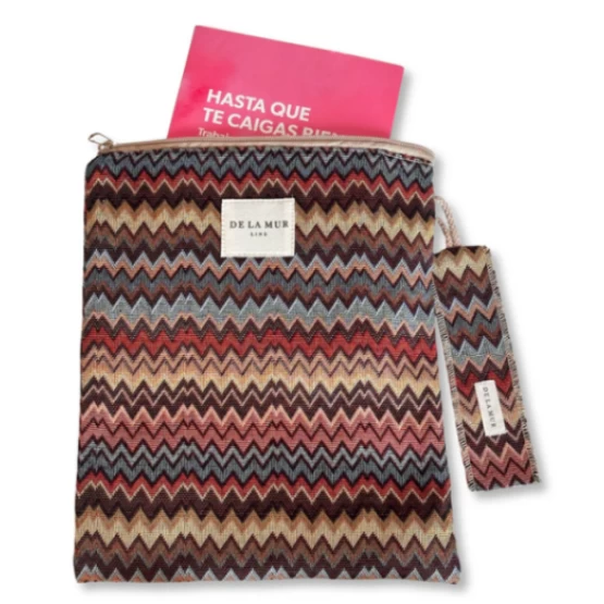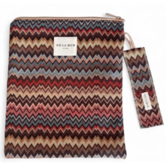 Buchhülle mit Reißverschluss und passendem Lesezeichen. Gefertigt aus dickem Jacquard-Gewebe mit mehrfarbigem Zickzackmuster. Innen mit dickem, grauem Stoff gefüttert. Pflegehinweis: Handwäsche in kaltem Wasser, nicht im Trockner trocknen.