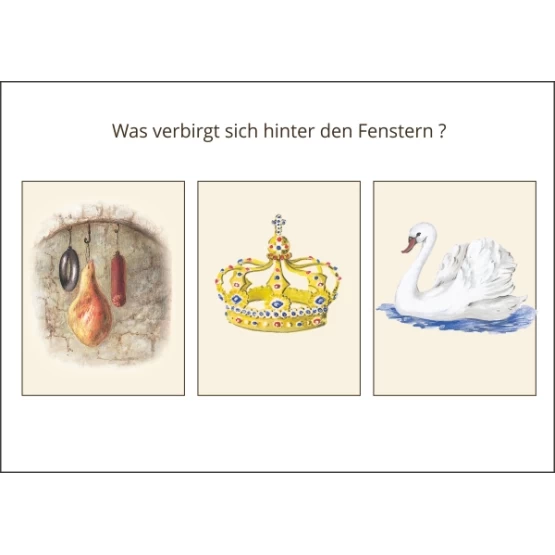 Die sorgfältig eingepassten Fenster geben beim Öffnen viele Bildchen mit Dingen, die in ein Schloss gehören, frei. Auch weihnachtliche Überraschungen fehlen nicht.