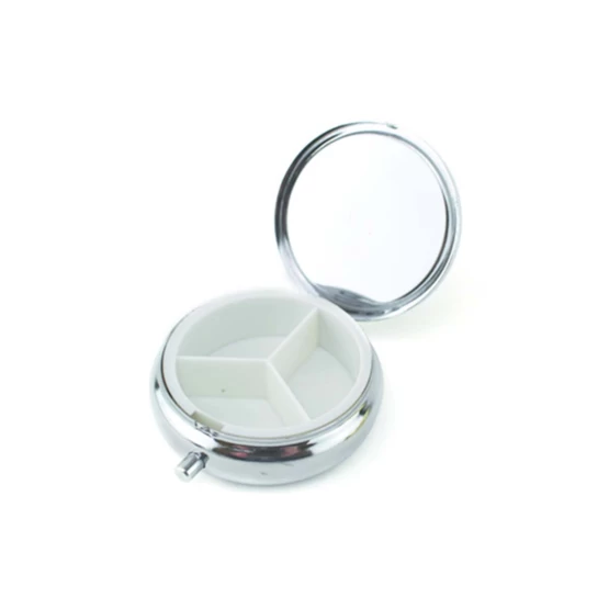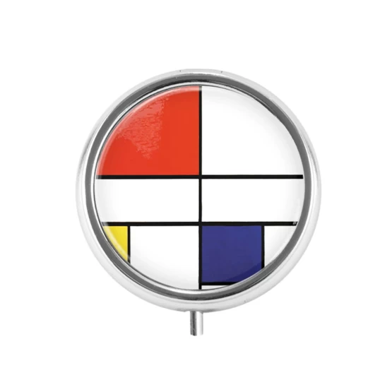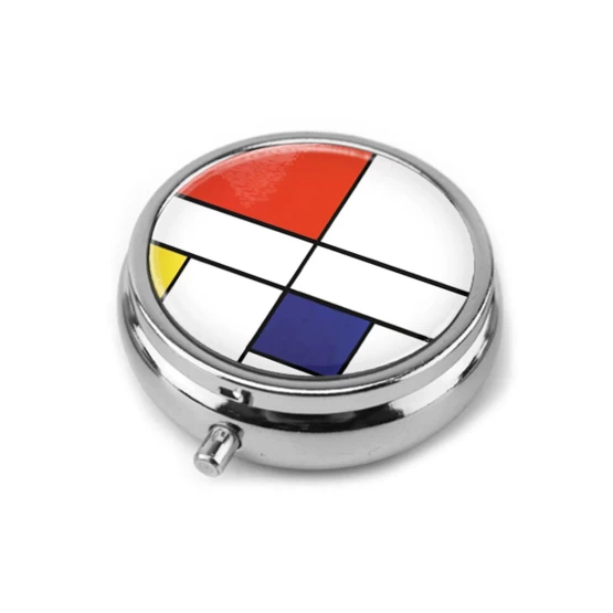 This silver-colored pill box is decorated with a beautiful imprint of composition with red area by Piet Mondriaan. With a push of a button you open the pill box and you will find three separate compartments on the inside.