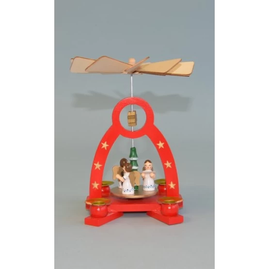 Die Pyramidenflügel werden von der aufsteigenden Kerzenwärme angetrieben, die später in den Kerzenhaltern entzündet werden. Das helle Kerzenlicht treibt aber nicht nur die Pyramidenflügel an, sondern beleuchtet die drei kleinen Engel und den Spanbaum in ihrer Mitte.