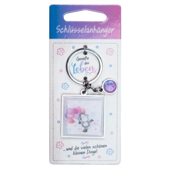 Mit diesem Schlüsselanhänger begleitet Dich das kleine Schäfchen mit den Luftballons überall mit hin. Der kleine runde Blumenanhänger ist ein extra Blickfang.