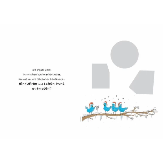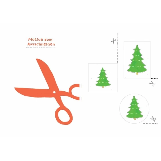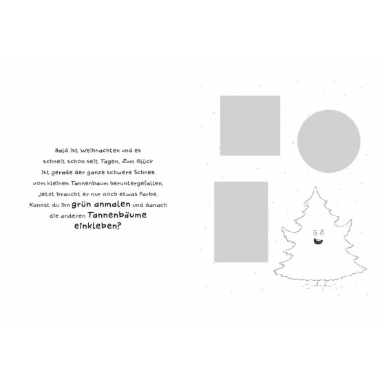 Ausschneiden, aufkleben, ausmalen - das sind die Grundfähigkeiten, die Kinder ab 3 Jahren mit dem kleinen Tannenbaum und seinen Freunden aus "Schüttel den Weihnachtsbaum" üben können.