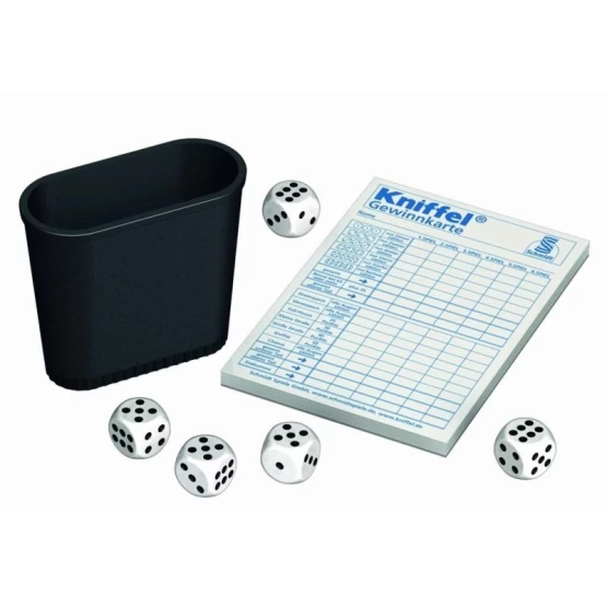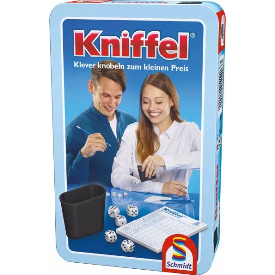 Alles drin ohne viel Drumherum. Mit Würfeln, einem Becher und einem Block ist hier alles zum Kniffeln bereit. Und das in der schönen Metalldose.