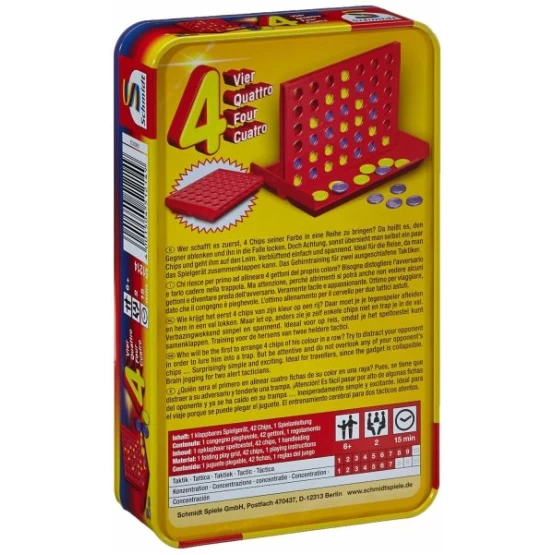Wer schafft es zuerst, 4 Chips seiner Farbe in eine Reihe zu bringen? Da kann man den Gegner in die Falle locken. Doch Achtung, nicht dass man ihm auf den Leim geht. Verblüffend einfach und spannend. Das Gehirntraining für zwei ausgeschlafene Taktiker in der Metalldose.