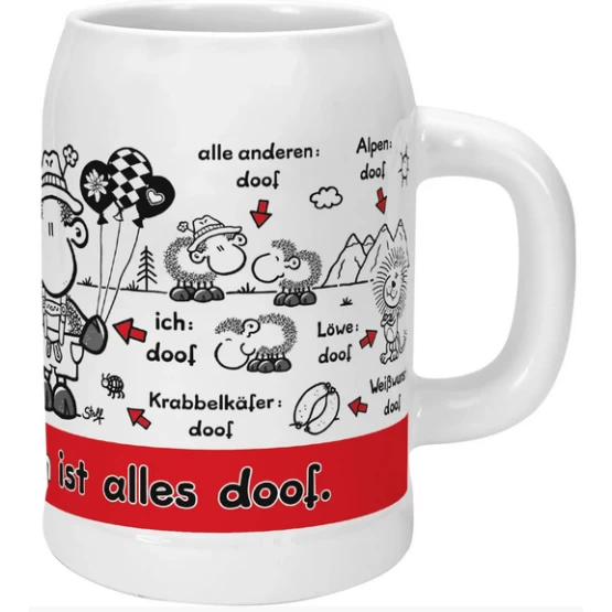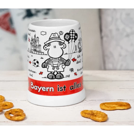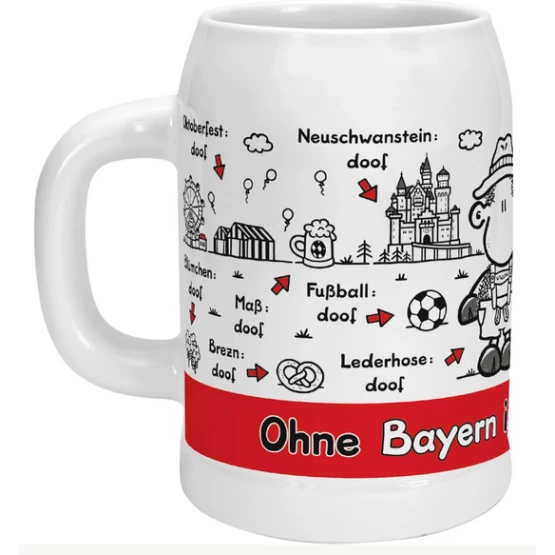 Ohne Bayern ist alles doof – keine Brezn, kein Maß, kein Neuschwanstein! Dieser sheepworld Bierkrug feiert das echte Lebensgefühl des Freistaats: zünftig, herzlich und mit einer großen Portion Humor. Das beliebte Kultschaf zeigt sich in Tracht zwischen Fußball, Alpen und Oktoberfest – einfach typisch bayerisch! Ob beim Grillabend, im Garten oder als Geschenk für echte Bayern-Fans: Dieser Krug bringt Gemütlichkeit, Lachen und eine Prise Heimat auf den Tisch. Denn: Mit Bayern im Herzen schmeckt’s einfach besser!