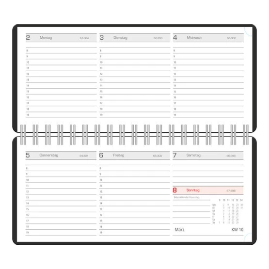 Spiral-Taschenkalender, ca. 8 x 18 cm, 144 Seiten, 72 Blatt, 1 Woche auf 2 Seiten, ideal geeignet für unterwegs