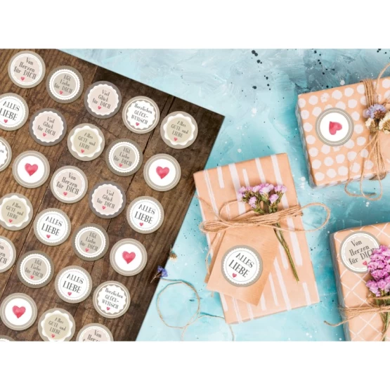Schöne Vintage Geschenkaufkleber - selbstklebend auf Etikettenpapier, ein Aufkleber mit Durchmesser 3,2 cm. Die Aufkleber in den Farben beige, braun, grau, weiß verziert mit kleinen roten Herzen sind mit verschiedenen Schriftzügen versehen. 7 verschiedene Glückwünsche, darunter VON HERZEN FÜR DICH, HERZLICHEN GLÜCKWUNSCH und ALLES GUTE UND LIEBE - perfekt zum Verzieren von Geburtstagsgeschenken.