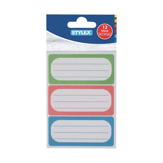 The package contains 12 stickers in green, red, and blue. Each sticker measures 34 x 74 mm.