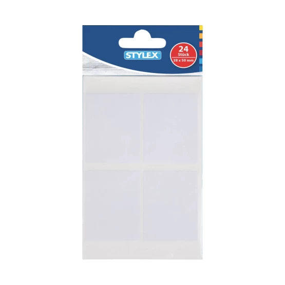 The package contains 24 white stickers Each sticker measures 38 x 50 mm.