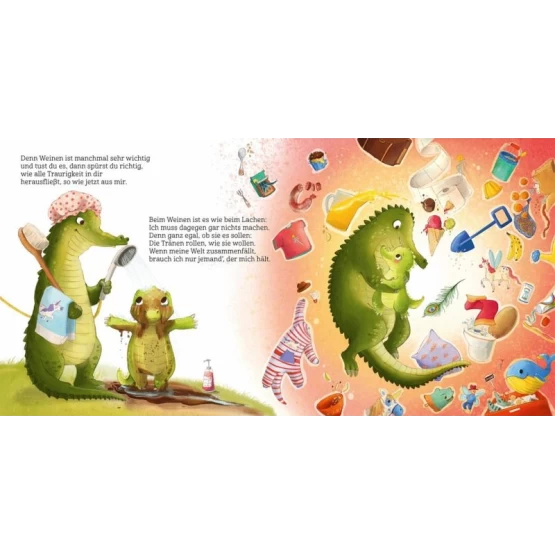 Ob bei Missgeschicken oder Übergängen, bei Angst und Wut, ja sogar bei Mitleid und purer Freude muss das kleine Krokodilkind oftmals weinen. Zum Glück ist Papa da und gibt Juli Zeit, Raum und Halt. Denn er weiß ganz genau, dass Tränen rollen, wie sie wollen und das kleine Krokodil ein Kuschelnest braucht, damit die Tränen mit der Zeit weniger werden können. Das Weinen ist für ein so wunderbar empfindsames Kind wie Juli ein wichtiges Ventil, um sein Erlebtes und Gefühltes zu verarbeiten.