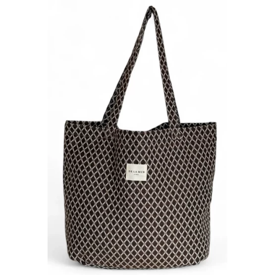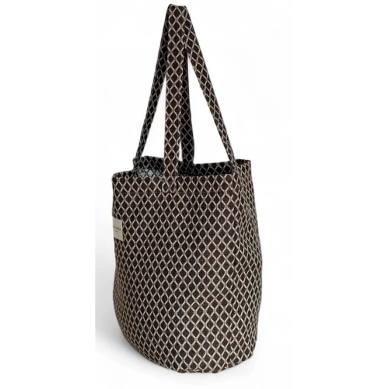 Große Einkaufstasche mit Schulterriemen. Gefertigt aus dickem Jacquard-Gewebe mit geometrischem Muster in Brauntönen. Pflegehinweis: Handwäsche in kaltem Wasser, nicht im Trockner trocknen.