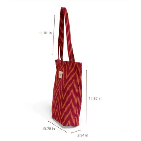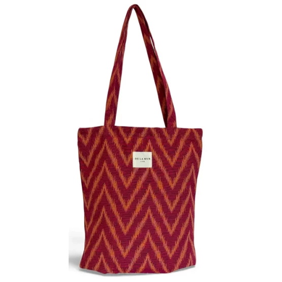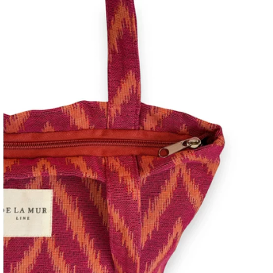 Medium zippered tote bag with shoulder straps. Made from jacquard fabric (80% cotton, 20% polyester) featuring a zigzag pattern in fuchsia pink and orange tones. Includes a top zipper closure. For proper care, we recommend washing in cold water and not tumble drying.