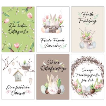 Verschicke liebe Ostergrüße an Deine Liebsten, Freunde, Verwandte und Kollegen! Mit unseren Osterpostkarten macht das in diesem Jahr mehr Spaß denn je. Im Set erhältst Du 6 Postkarten mit unterschiedlichen Designs. Unsere Karten (Postkarten Standardgröße DIN A6) haben wir dieses Jahr mit ganz viel Liebe zum Detail für euch entworfen.