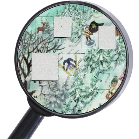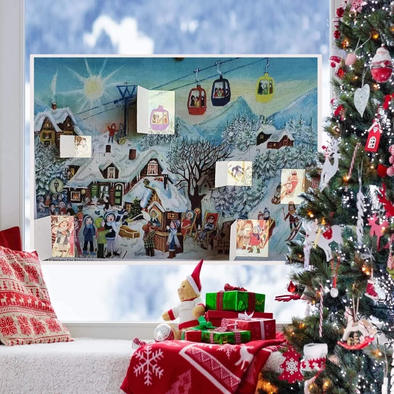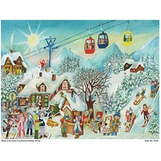 Das Herz eines jeden Skifahrers wird bei diesem Adventskalender höher schlagen! Ein buntes Treiben im Skigebiet, wie man es sich wünscht: Dick verschneite Landschaft, beeindruckende Berge, die Menschen gut gelaunt und fröhlich und bunte Gondeln, die die Menschen den Berg hinauf transportieren. Die einen sind noch fleißig am Ski fahren und rodeln, die anderen machen schon Pause: essen und trinken, liegen im Liegestuhl in der Sonne und lassen sich von zwei Musikantn unerhalten.